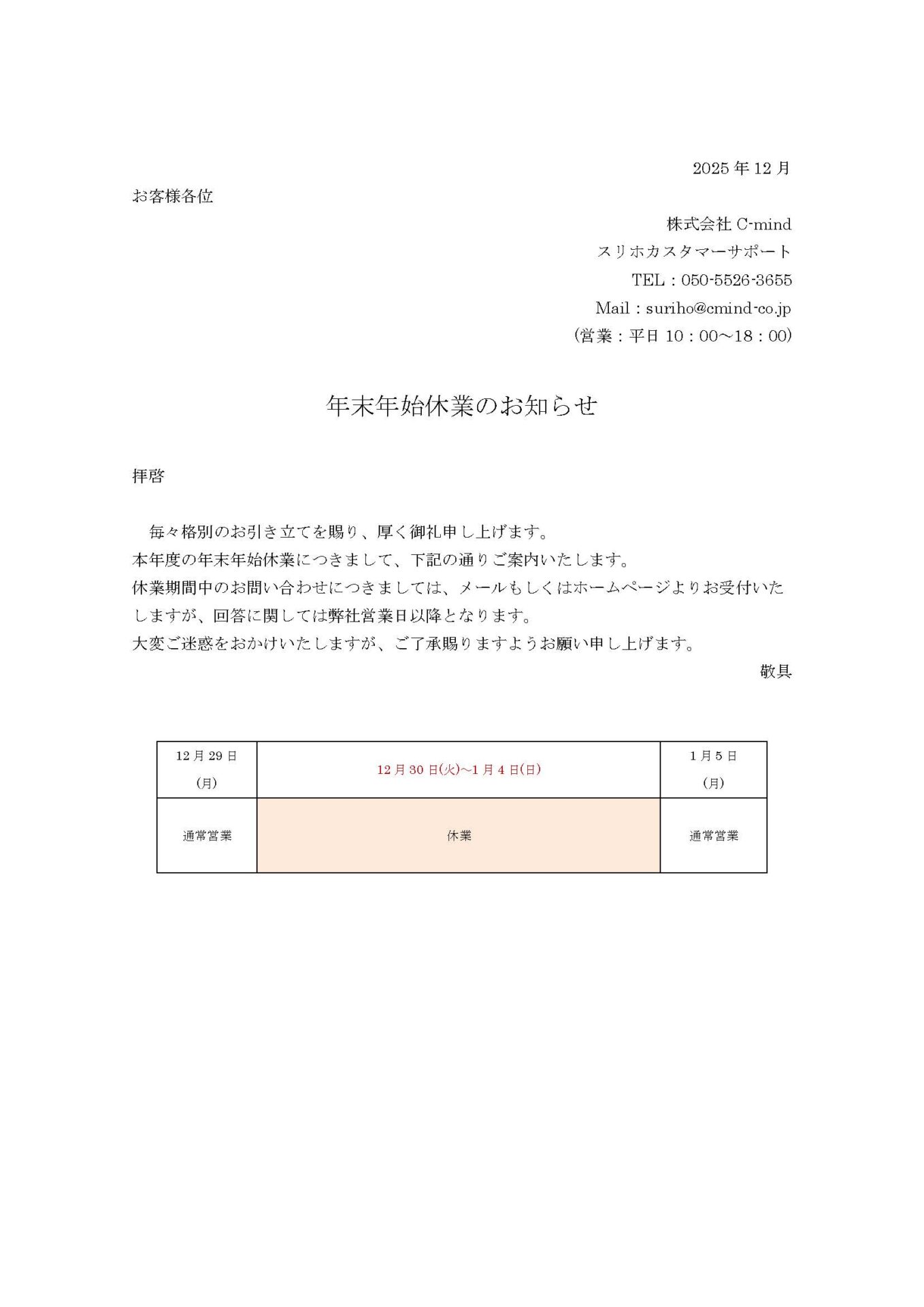 定額制プリンターレンタルサービス[スリホ]-HOME- > 新着情報 > お知らせ > 年末年始休業のお知らせ