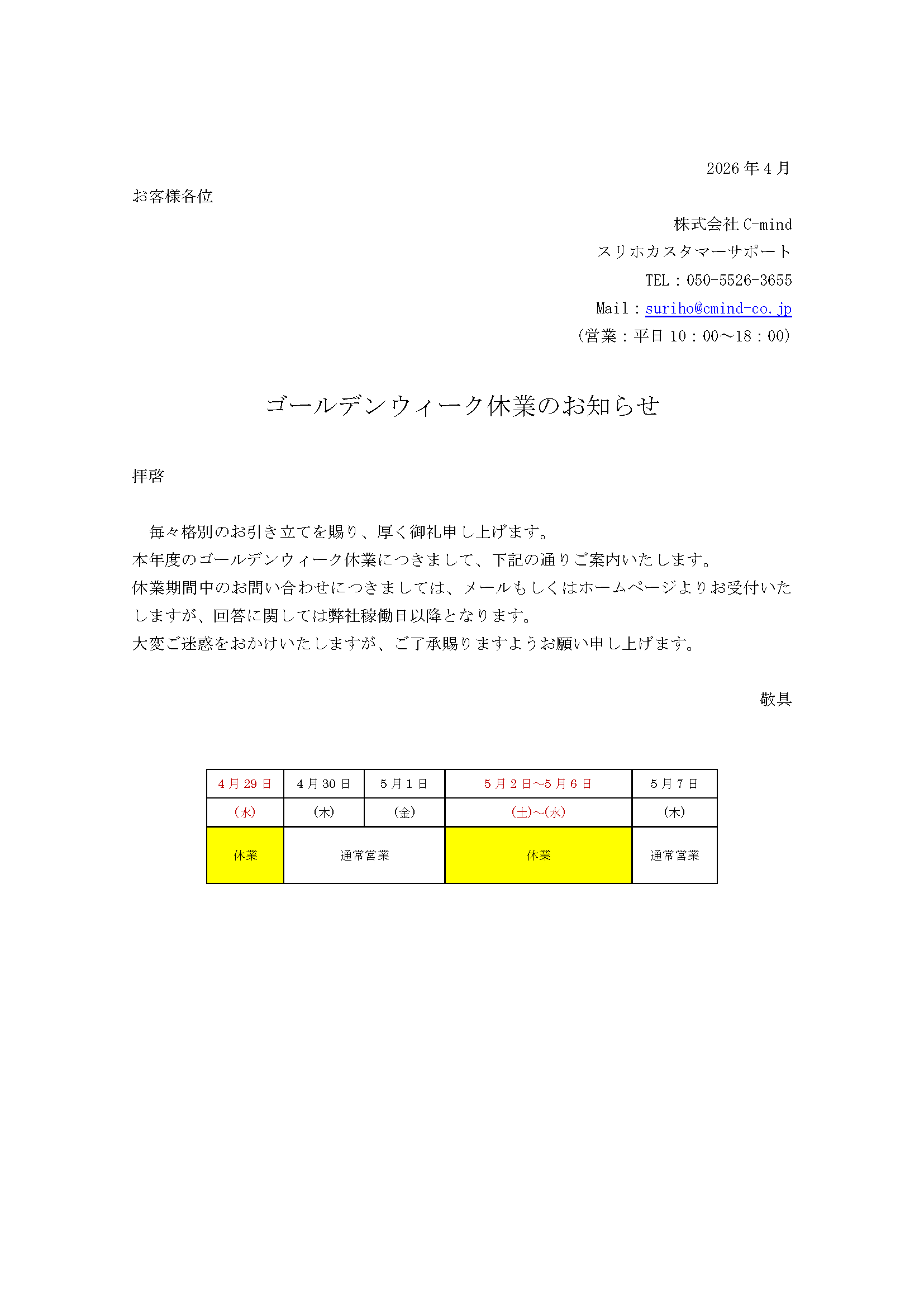 定額制プリンターレンタルサービス[スリホ]-HOME- > 新着情報 > お知らせ > ゴールデンウィーク休業のお知らせ